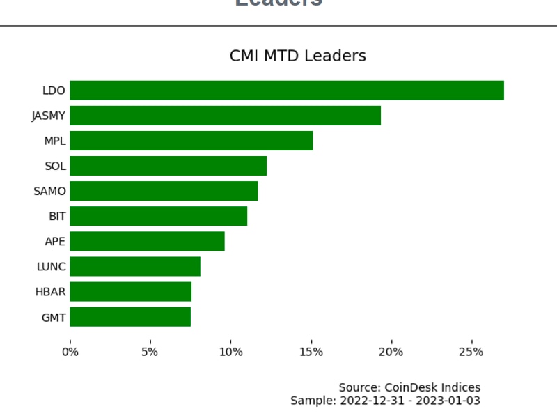 The governance token of the Lido decentralized autonomous organization surged 26% so far in 2023, surpassing bitcoin and ether’s performance. 142 assets of 163 assets in the CoinDesk Market Index are trading higher in the new year.