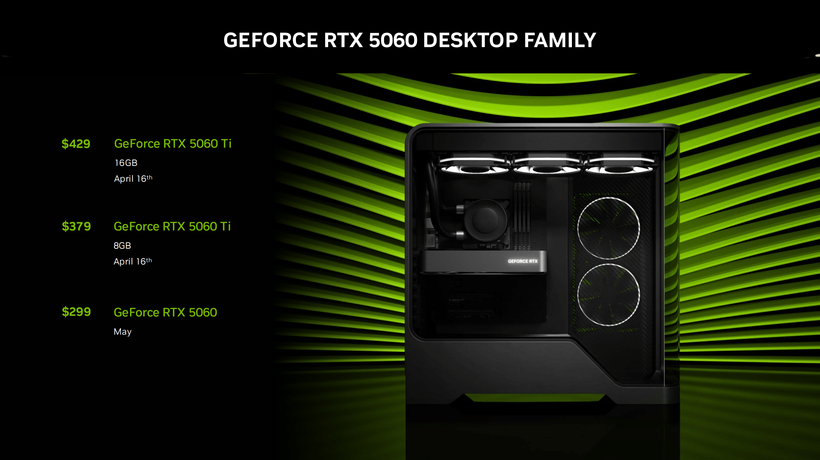 Nvidia is announcing its RTX 5060 family of GPUs today, just a day before it releases the RTX 5060 Ti on April 16th. Two variants of the RTX 5060 Ti are launching, the $379 8GB of VRAM model and the $429 16GB version. The $299 RTX 5060 will launch at some point in May with … Read more