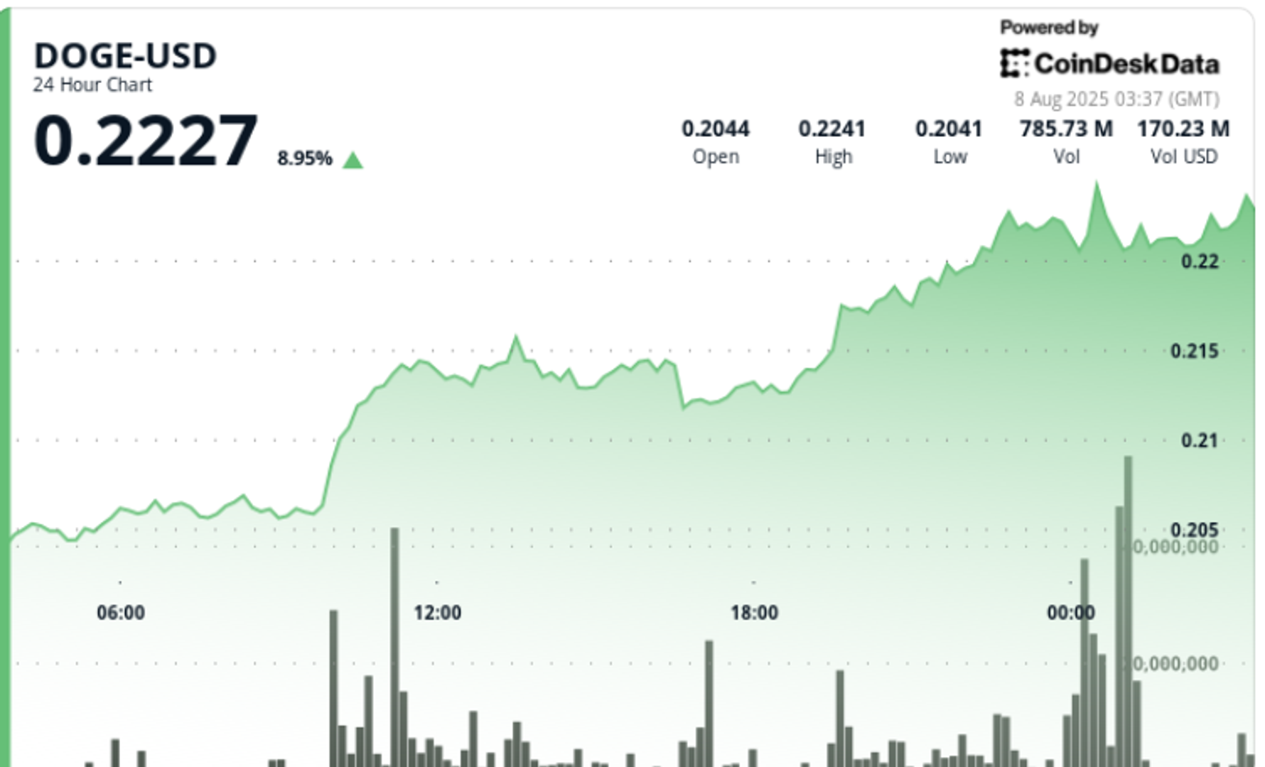 DOGE jumped 8.4% in the 24-hour period ending August 8, climbing from $0.20 to $0.22 in a two-phase rally. Price action spans a $0.021 range, marking 9.5% volatility. As per CoinDesk analytics, a new resistance forms at $0.222-$0.224, while support holds at $0.220. Consolidation appears likely before the next directional move. Price Action Summary • … Read more