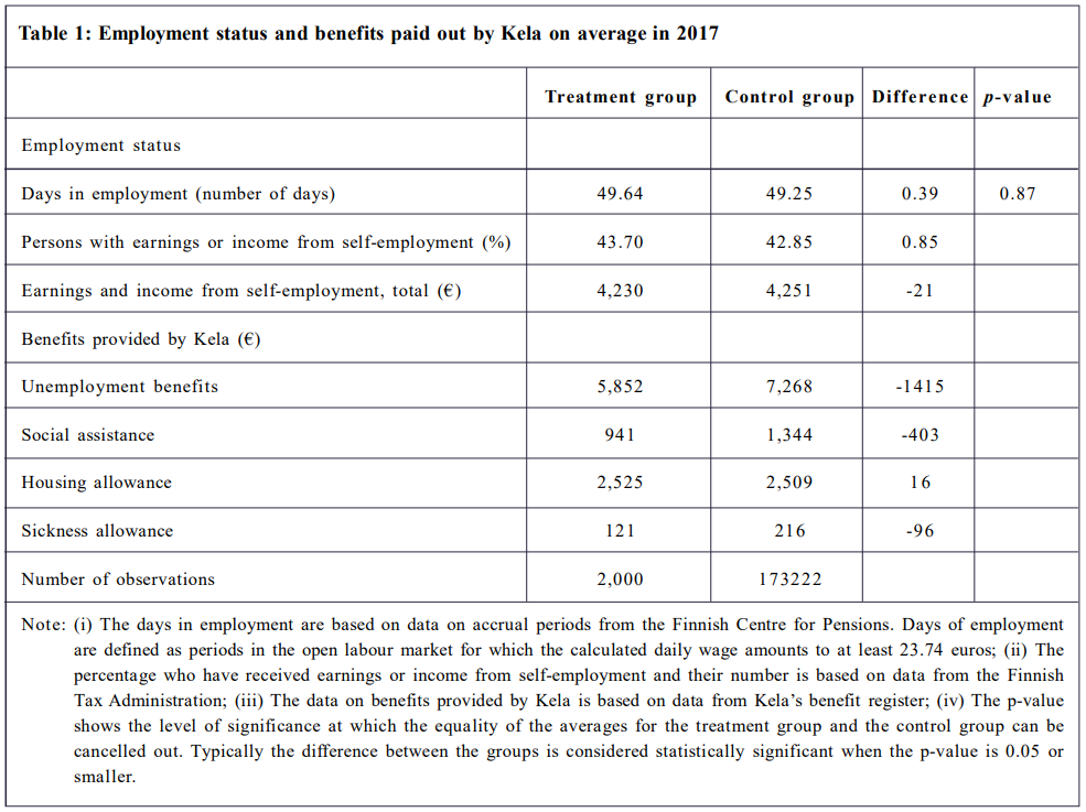 The recent Basic Income Experiment run by Kela, the Social Insurance Institution of Finland allocated €560 per month unconditionally to 5,000 unemployed citizens between the ages of 25 and 58 with the initial expectation of “promot[ing] active participation and giv[ing] people a stronger incentive to work” in response to the changing nature of work due to automation, (Kansaneläkelaitos, 2019).However, the two-year experiment ended in late 2018 with its preliminary results showing “no effects on employment.” Compared to non-recipients, the participants receiving benefits from Kela showed little improvements, if not adverse outcomes. Specifically, as Table 1 shows, the total number of employment days for the treatment group was merely 0.39 longer, and self-employment incomes were actually €21 lower than those of the control group (Fabric et al., 2019). This attests to the failure of one of the most prominent UBI programs.