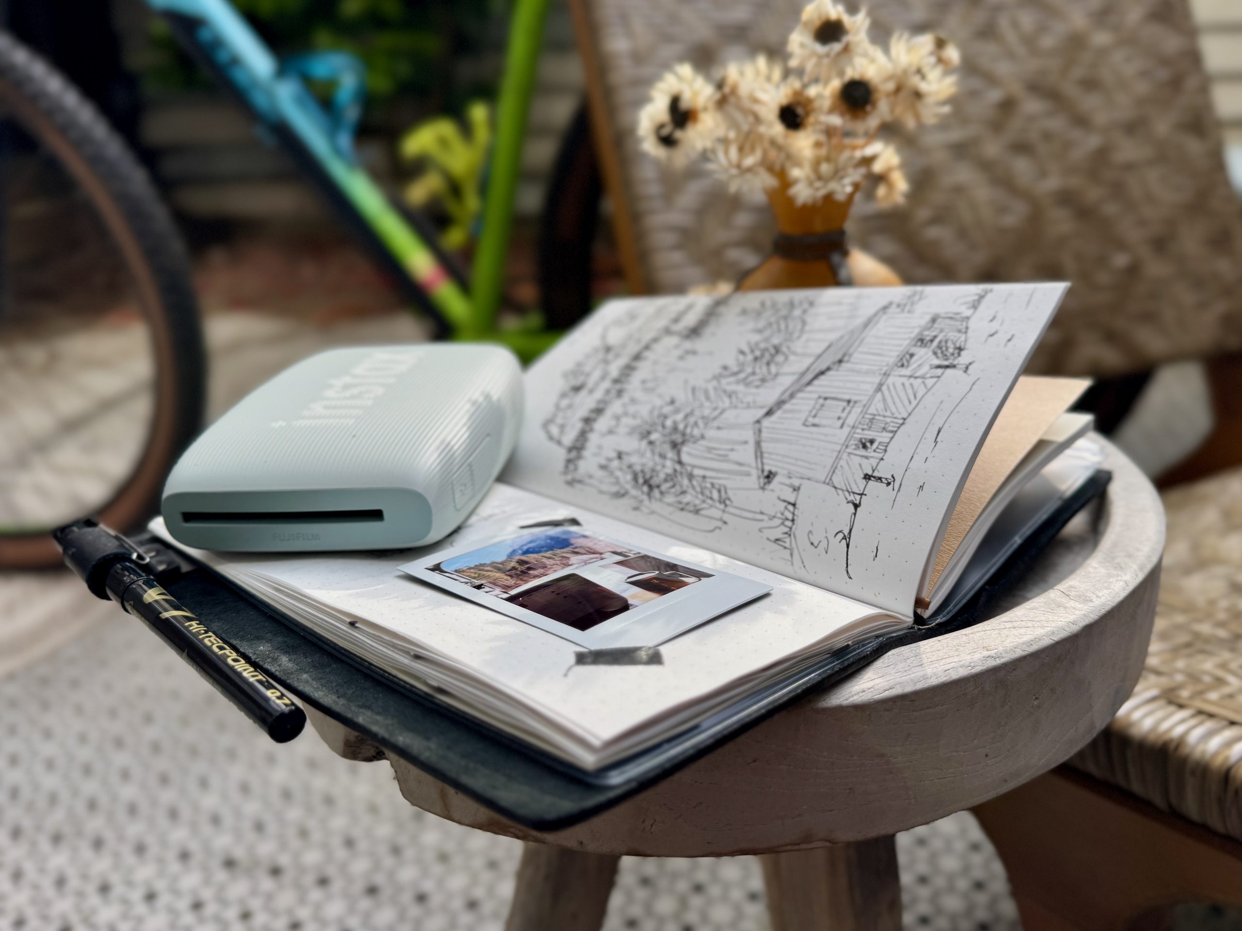 My journaling kit consists of three main parts: a Pilot V7 pen, a notebook from the Traveler’s Company, and a Fujifilm Instax Mini Link 3 photo printer.