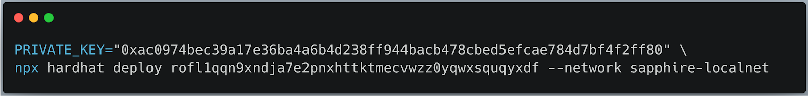 We can also verify the contract on the sapphire-localnet network. First, set up the PRIVATE_KEY for your deployment account and the identifier for the ROFL app. Then, you can deploy the contract by running the following command: