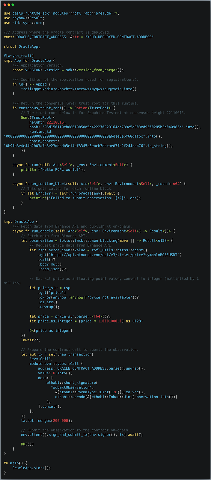Next, implement the off-chain component of the oracle in Rust. This code will run inside the ROFL environment, which provides a secure enclave for off-chain logic.
