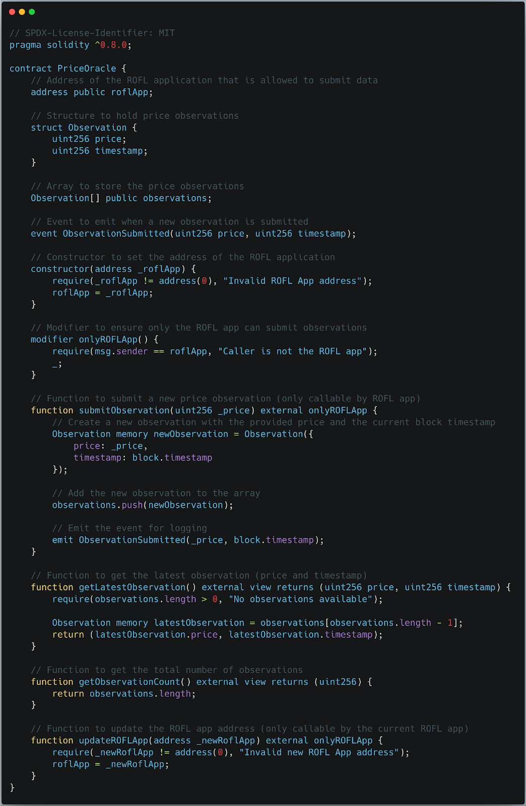 The PriceOracle contract stores observations submitted by the ROFL oracle. Only the ROFL application (identified by the roflApp address) can call submitObservation. This ensures that the data is only modified by the trusted ROFL app, maintaining the integrity of the oracle data.