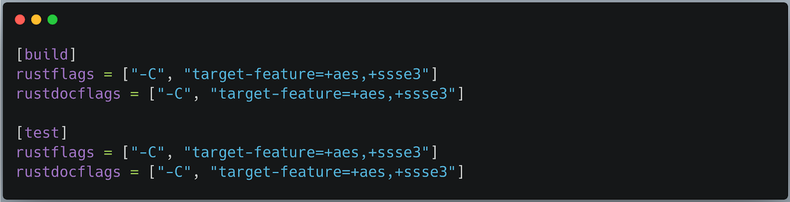 Furthermore, due to upstream dependencies, Cargo must be configured to always build with specific CPU platform features (namely AES-NI and SSE3). To do this, create a .cargo/config.toml file with the following settings: