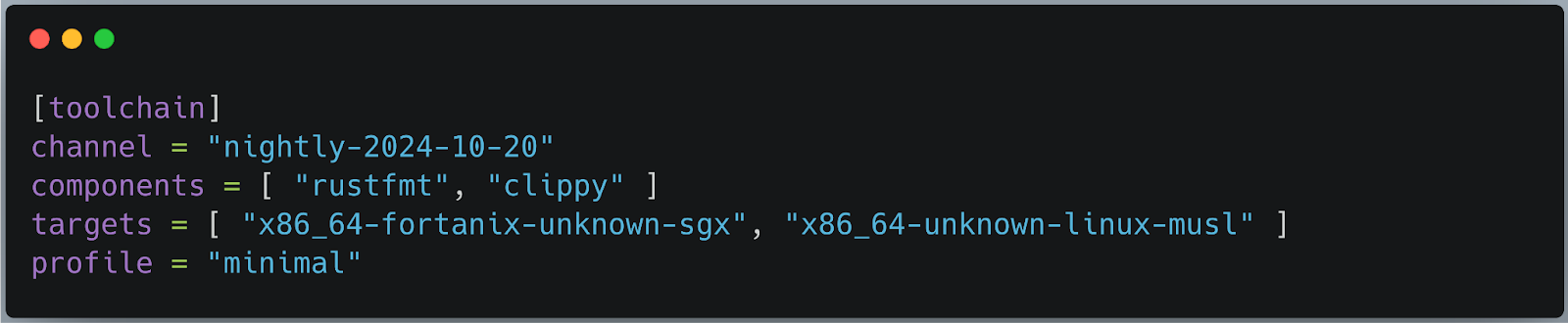 Since the Runtime SDK relies on a nightly version of the Rust toolchain, you must specify which version to use by creating a rust-toolchain.toml file with the following configuration: