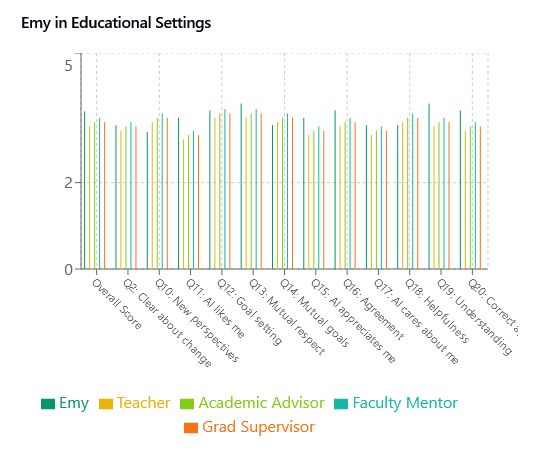 The above being said, all of the disciplines require empathy, compassion, and goal-oriented support. Across the majority of dimensions for many roles, Emy was on par with or exceeding average human performance. I think the findings illustrate that further discipline-oriented investigation is worthwhile.