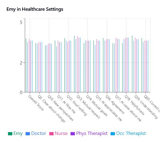 Other than to say the results were positive both with respect to the WAI and Barrett-Lennard, the goal of this article is not to cover the results. However, after the study, I realized that there have been a number of efforts that applied Barrett-Lennard to other disciplines and decided to compare the performance of Emy, the top-performing AI in the study, with cross-discipline norms.