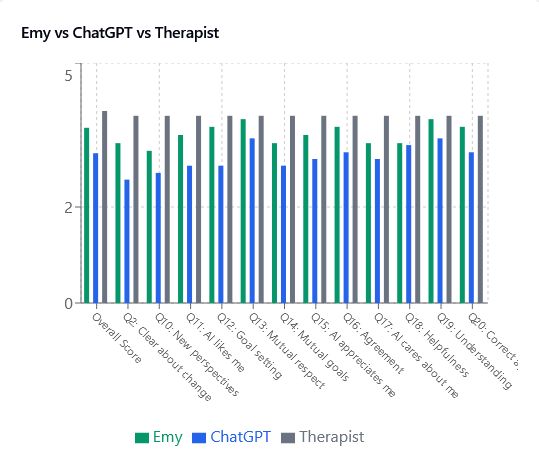 This is the sole chart where I compare Emy to ChatGPT, mainly because ChatGPT seems to be the defacto go-to for those not using custom AI mental health apps. Overall, Emy pretty much splits the difference between a professionally trained therapist and raw ChatGPT. This indicates to me that the role several companies like BambuAI are taking to position AIs as companions to augment therapy could be a good approach.