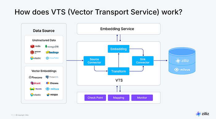 VTS (Vector Transport Service) is an open-source tool developed by Zilliz. It is focused on the migration of vectors and unstructured data. VTS’s core feature is its development based on Apache SeaTunnel, which gives it a significant advantage in data processing and migration. As a distributed data integration platform, Apache SeaTunnel is known for its rich connector system and multi-engine support. VTS further extends its capabilities in vector database migration and unstructured data processing.