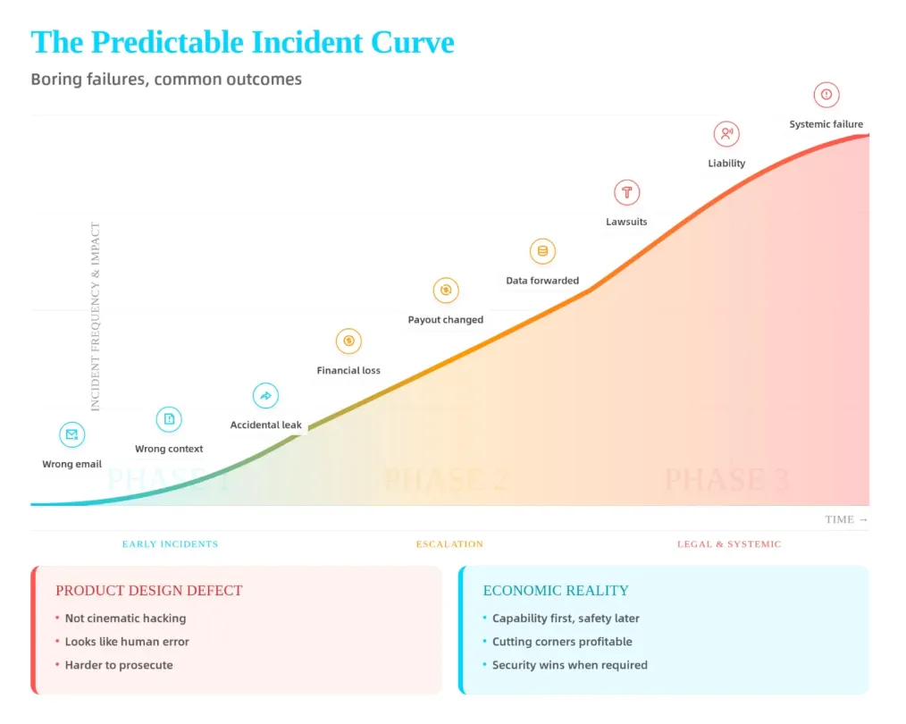 People think the first big agent failure will be like something out of a movie with a hacker sneaking into a vault.. The truth is, agent failures will be pretty boring. They will happen all the time. For example an agent might send an email to the person with the wrong information and in the wrong context. The user will not even notice until the damage, to their reputation is already done.