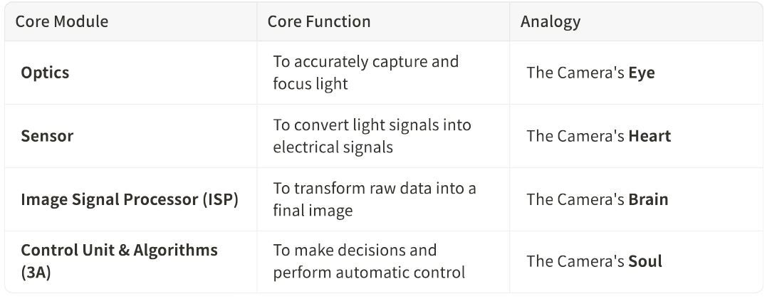 In fact, viewing the “camera” from different positions in the industry chain provides vastly different perspectives. At a camera manufacturing plant, engineers focus on assembling various components into a reliable product. At an IC design house, the focus shifts to creating powerful chips. And at a brand-name company, the team must define “good image quality” from the standpoint of system integration and user experience. It is this convergence of diverse perspectives that reveals a profound truth: a high-quality image is never the result of a single component’s merit. Therefore, this series of articles will guide readers through a deconstruction of the camera, delving into its core to explore the four modules that truly determine the success or failure of an image: the Optics, the Sensor, the Image Signal Processor (ISP), and the Control Unit & Algorithms.