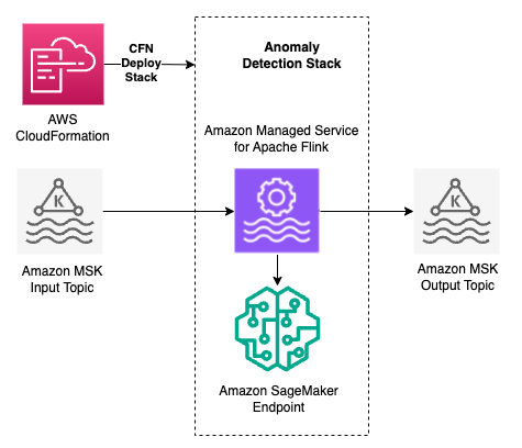 This solution uses a CloudFormation template, which takes inputs such as MSK broker endpoint and topics, AWS Identity and Access Management (IAM) roles, and other parameters related to virtual private cloud (VPC) configuration. The template creates the essential resources like the Apache Flink application and Amazon SageMaker real-time endpoint in the customer account.