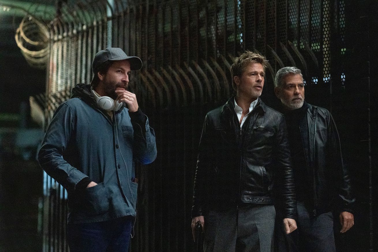 Picture of director Jon Watts (left) standing with actors Brad Pitt (middle) and George Clooney (right) on the set of Wolfs.