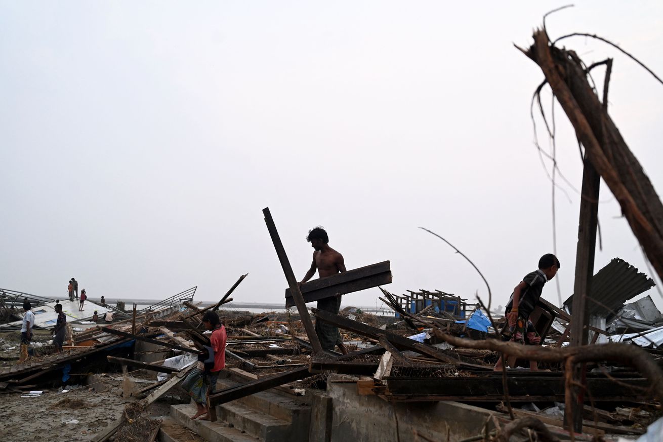 Residents clean debris of their destroyed houses at the Khaung Dote Khar Rohingya refugee camp in Myanmar’s Rakhine state on May 15th, 2023, after Cyclone Mocha made landfall. | Photo by Sai Aung Main / AFP via Getty Images
