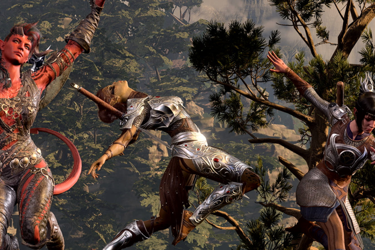 Screenshot from Baldur’s Gate 3 featuring three party members from left to right, Karlach, Lae’zel, and Shadowheart frozen in humorous action poses to illustrate the game’s forthcoming photo mode.