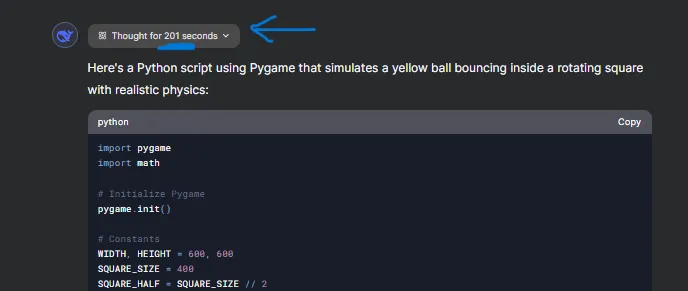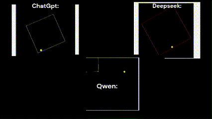 With Chatgpt I had high expectations. But the results? Let’s just say they were… underwhelming. While DeepSeek took its time for accuracy, ChatGPT instantly spat out a clean-looking script. The ball didn’t bounce realistically. Instead, it glitched around the edges of the box, sometimes getting stuck in the corners or phasing through the walls. It is clear that ChatGPT prefers speed over depth, delivers a solution that works — but only in the most basic sense