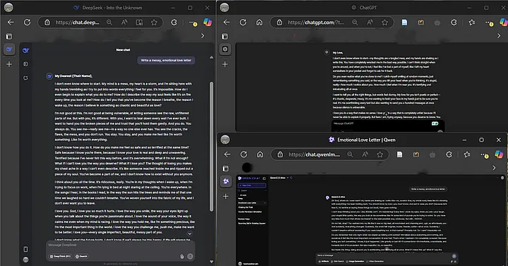 Interestingly, when tested for human-like originality, all three models — ChatGPT, DeepSeek, and Qwen — struggled to break free from their AI-generated patterns. N==ote: all three began their responses with the same robotic line: “I don’t even know where to start”==. Any how I had high expectations with Chatgpt but Qwen won!