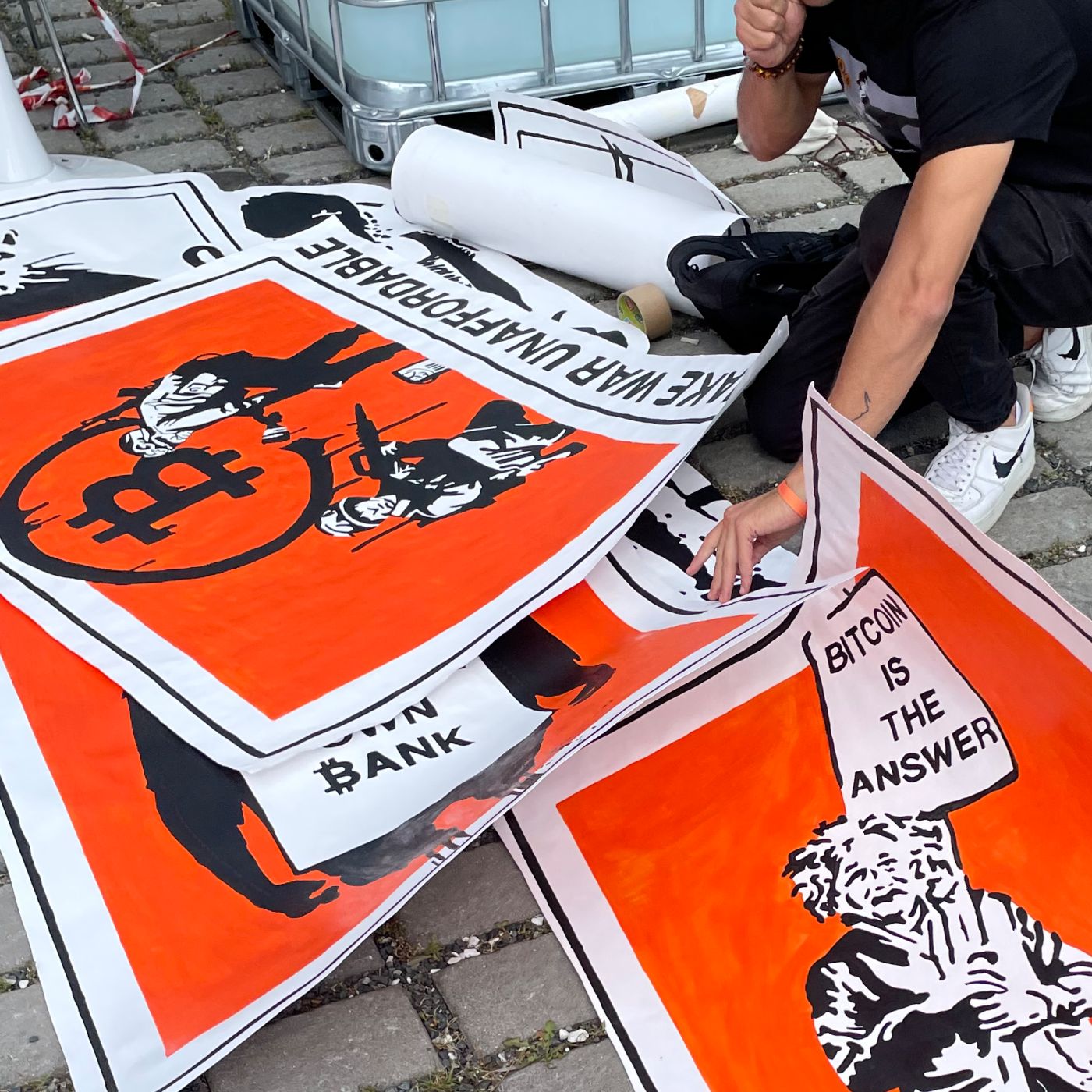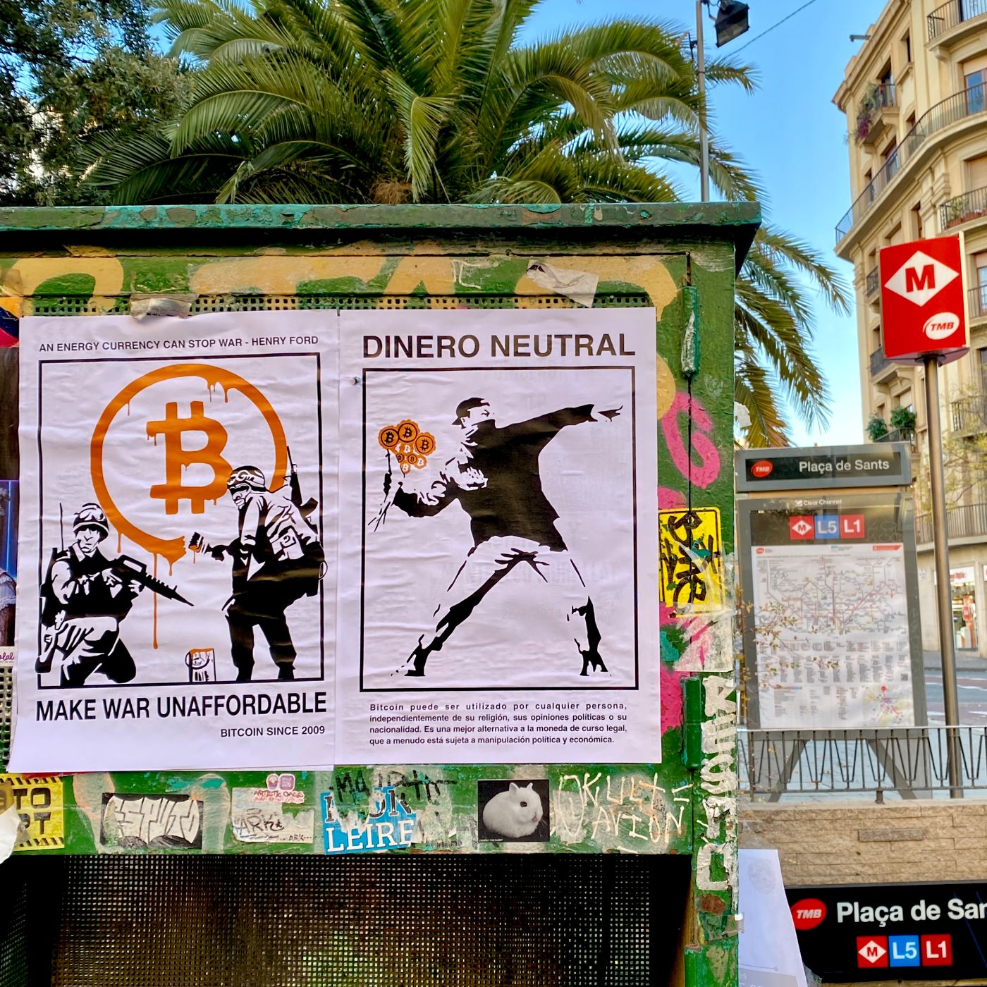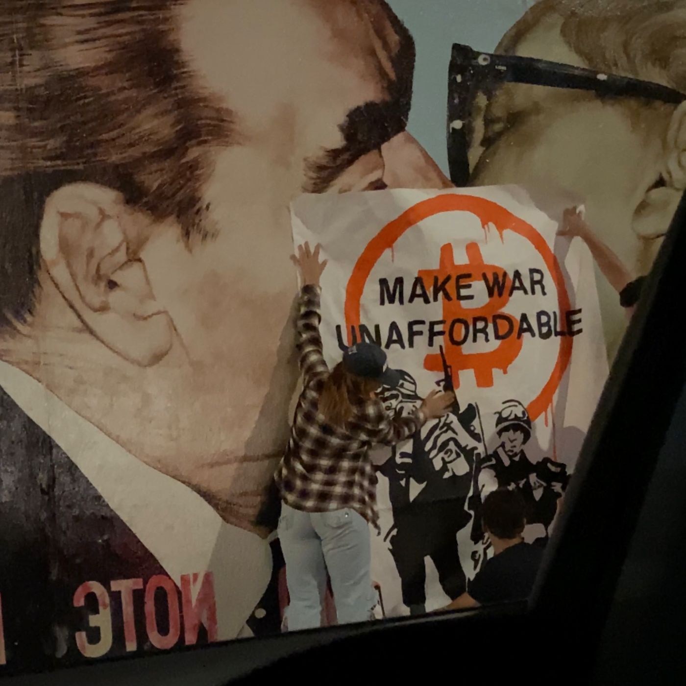 STREET CYBER: ==The “Make War Unaffordable” poster was created to protest war and violence.== It highlights the high cost of war, both in human lives and money. ==We believe Bitcoin’s resistance to inflation is key to making war unaffordable. By challenging traditional finance, Bitcoin can empower people and promote peace.==