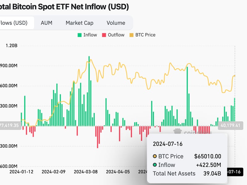 Bitcoin ETF Inflows Hit Six-Week High of $422.5M July 17, 2024 by BTC’s price has recovered 23% since hitting lows near $53,500 on July 5.