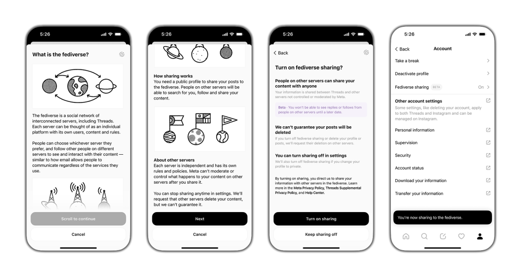 “With our beta experience, Threads users aged 18+ with public profiles can now choose to enable sharing to the Fediverse. If they do, they’ll be able to publish posts on Threads that will be viewable on other ActivityPub-compliant servers. Threads users will also be able to see aggregated like counts on their posts from other Fediverse servers directly from the Threads app. If people on other Fediverse servers follow federated Threads profiles, they’ll be able to see, reply to, and repost Threads posts (if their server allows it).” — Meta, March 21, 2024