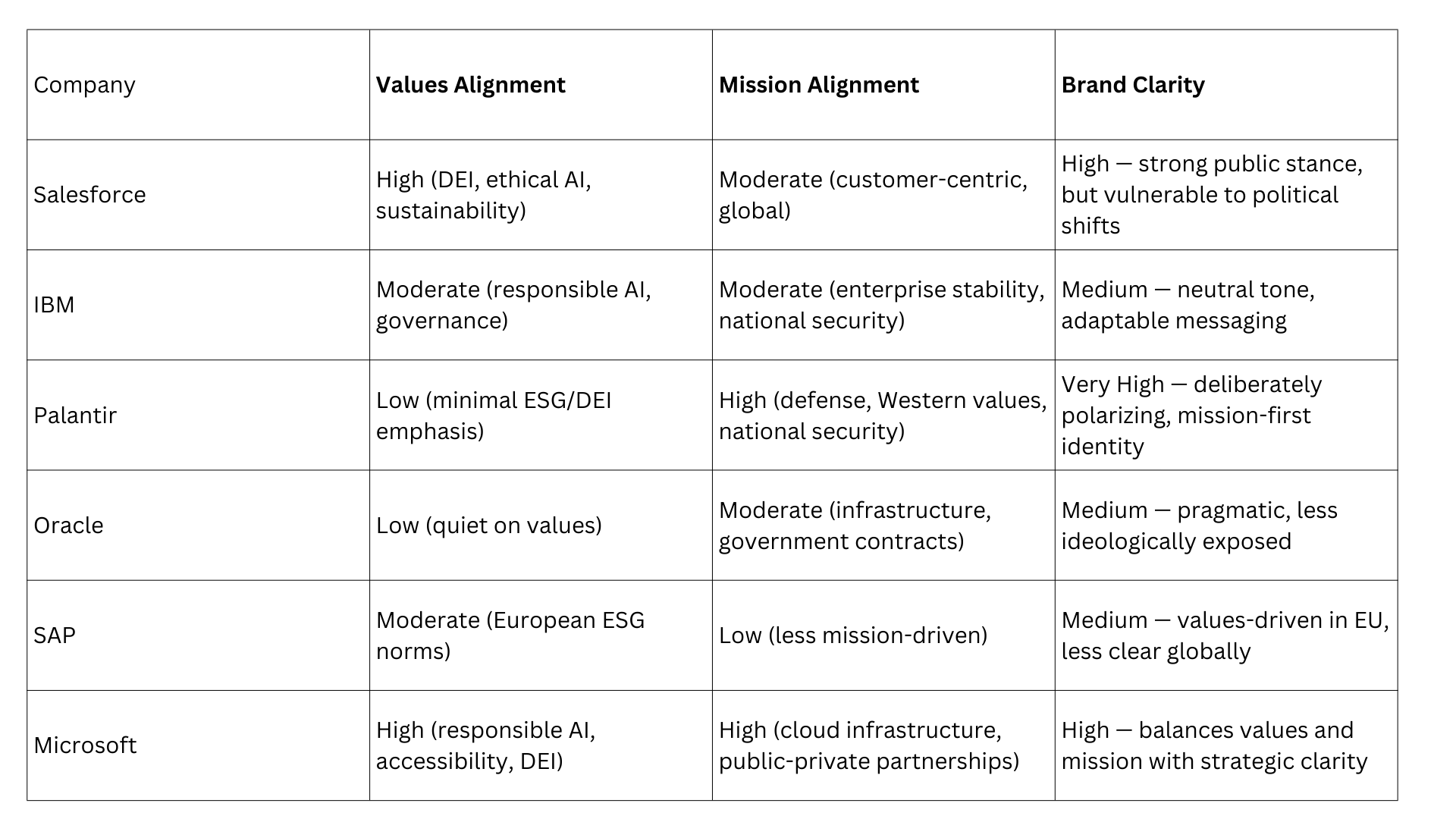 Salesforce, for example, has built its brand around ethical AI and DEI. But if federal clients deprioritize those values, it risks misalignment. Palantir, by contrast, thrives on clarity—it’s unapologetically mission-first. Microsoft stands out for balancing both worlds with strategic coherence.