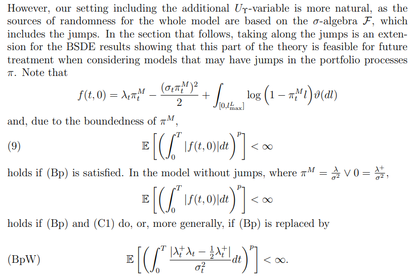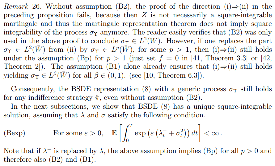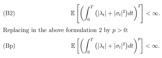 To be able to apply all the necessary BSDE machinery, we need to make for now stronger integrability and boundedness assumptions on the underlying market model. First, we consider a set of assumptions that strengthen the integrability assumption (B1):