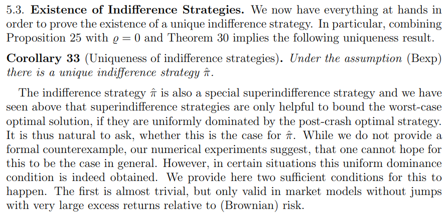 5.3. Existence of Indifference Strategies. We now have everything at hands in order to prove the existence of a unique indifference strategy. In particular, combining Proposition 25 with ϱ = 0 and Theorem 30 implies the following uniqueness result.