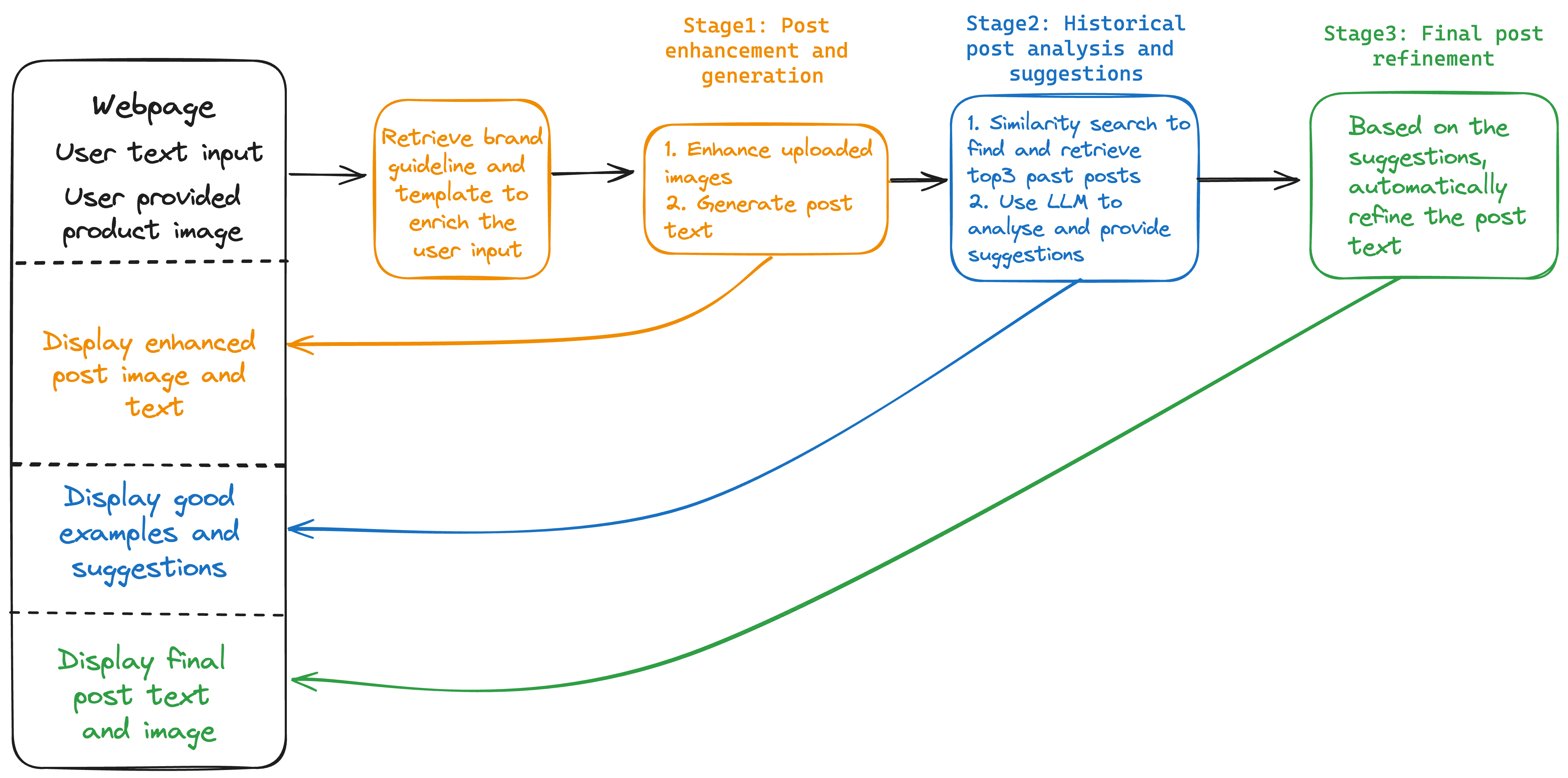 Finally, based on the generated recommendations, the post text is further refined and provided to the user on the webpage. The following diagram illustrates the end-to-end new content creation process.