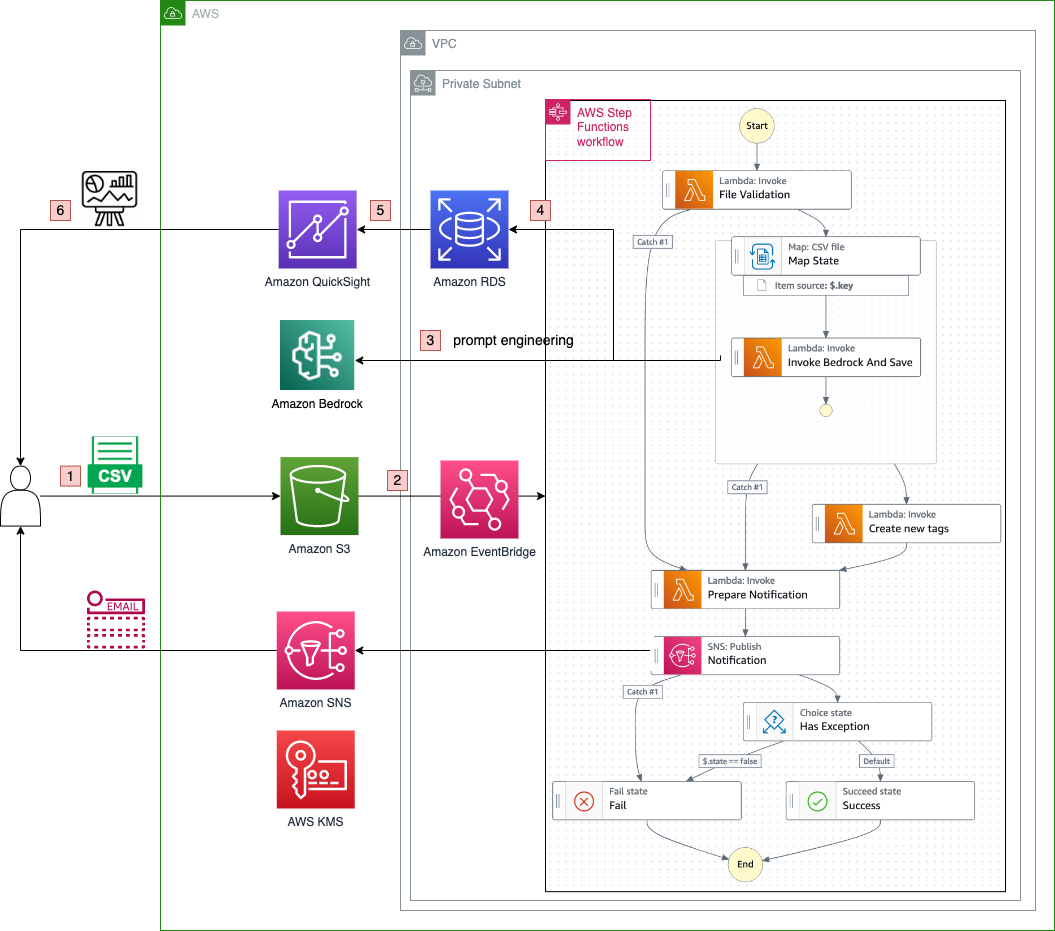 In the following sections, we highlight the key components to explain this automated framework for insight discovery: workflow orchestration with Step Functions, prompt engineering for the LLM, and visualization with QuickSight.