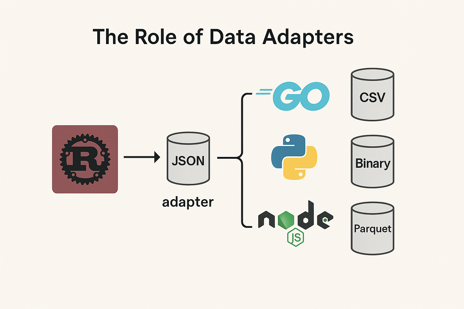 The beauty of this approach is that each node can seamlessly work with different data representations, as long as there’s an adapter for them. Whether you prefer JSON, CSV, binary blobs, or even specialized formats (like Parquet or Avro), adapters keep the underlying implementation details out of the node’s logic. That way, Rust stays focused on ingestion performance, Python remains laser-focused on ML tasks, and Node.js is free to handle whatever output format suits your external APIs—without forcing the entire pipeline to stick to one rigid standard.