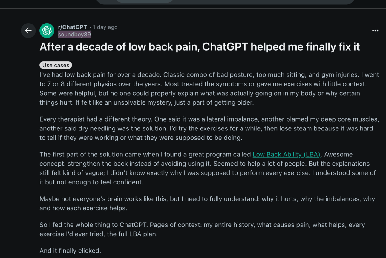 Every physio I’ve gone to gave me one person’s take, one angle. But with ChatGPT, I’m getting a compendium of all physical therapy knowledge known to man, filtered through more personal context than I could ever give a physio in an hour-long appointment, and tailored to my specific learning style. Not to make it sound like an ad but… best $20/mo I’ve ever spent.