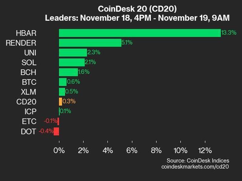 CoinDesk 20 Performance Update: HBAR Gains 13.3%, Leading Index Higher from Monday November 19, 2024 by Render was also among the top performers, gaining 5.1%.