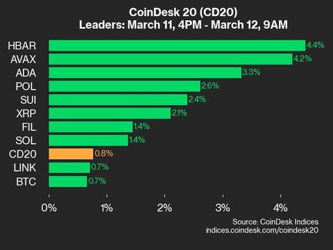 Leaders: HBAR (+4.4%) and AVAX (+4.2%).