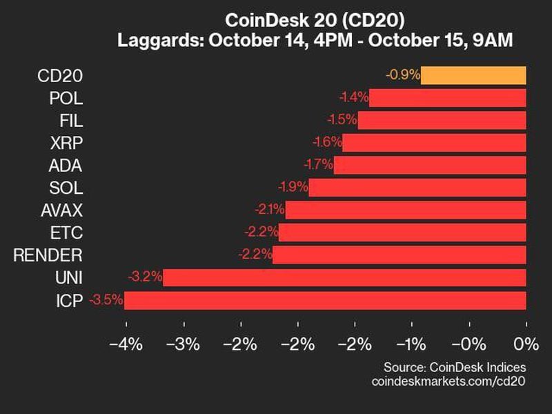 CoinDesk 20 Performance Update: ICP Drops 3.5% as Index Inches Lower From Monday October 15, 2024 by Uniswap joined Internet Computer as one of the weakest performers, falling 3.2%