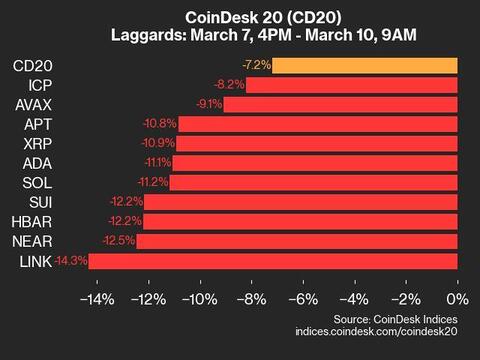 CoinDesk 20 Performance Update: Index Drops 7.2% as All Assets Trade Lower