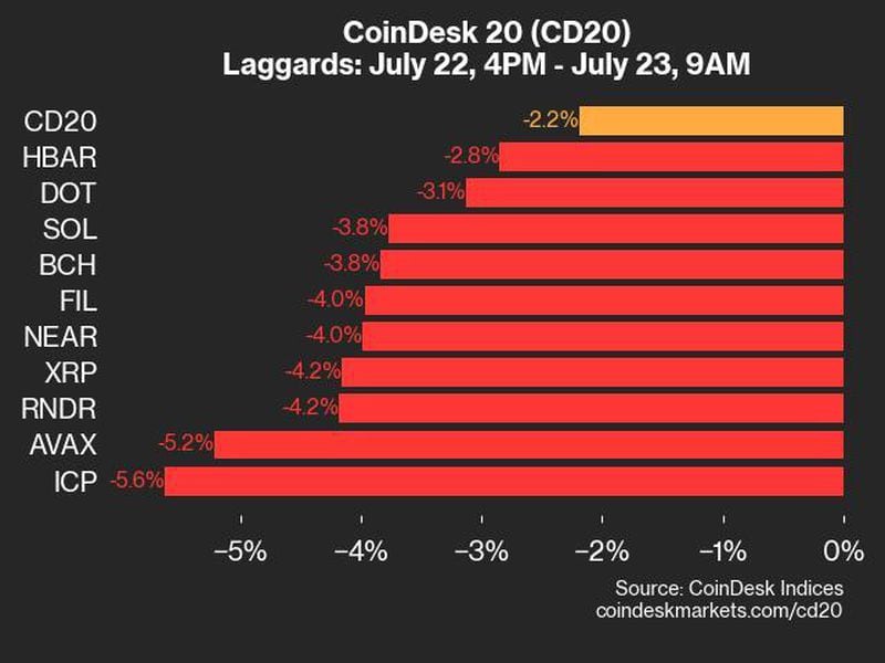CoinDesk 20 Performance Update: Index Slips 2.2% as Spot Ether ETFs Begin Trading July 23, 2024 by A decline of 5.6% in ICP and 5.2% in AVAX dragged the index down in overnight trading.