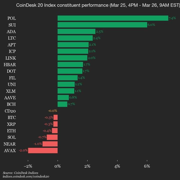Laggards: AVAX (-2.0%) and NEAR (-1.0%).