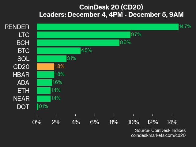 Leaders: RENDER (+14.7%) and LTC (+9.7%).