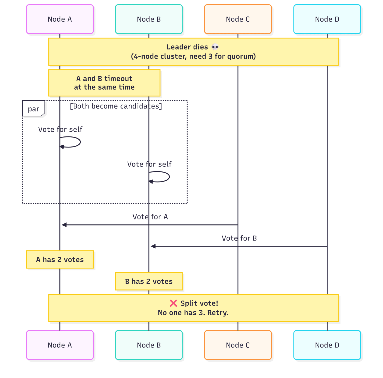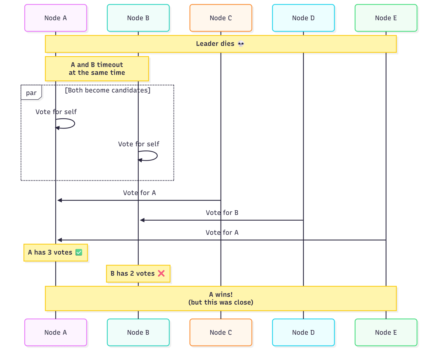 Two nodes timeout simultaneously and both become candidates. This time A squeaks by with 3 votes, but it was close. If one more node had voted for B, we’d have a split.