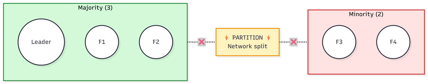 Similar to Paxos, Raft requires a majority quorum to make decisions. Like our previous example, in a 5-node cluster, you’d need 3 nodes to agree. If you can only reach 2 nodes, the system would stop accepting writes.
