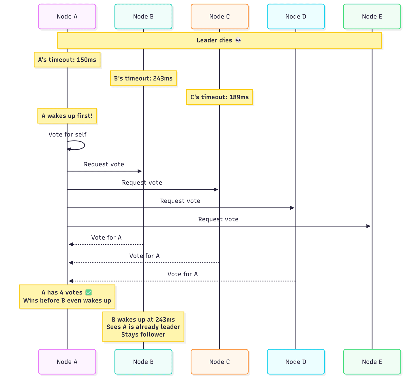Randomized timeouts fix this. Each node picks a random timeout (e.g., 150-300ms). Node A wakes up first at 150ms and campaigns unopposed. By the time B wakes up at 243ms, A is already leader. No split, no drama.
