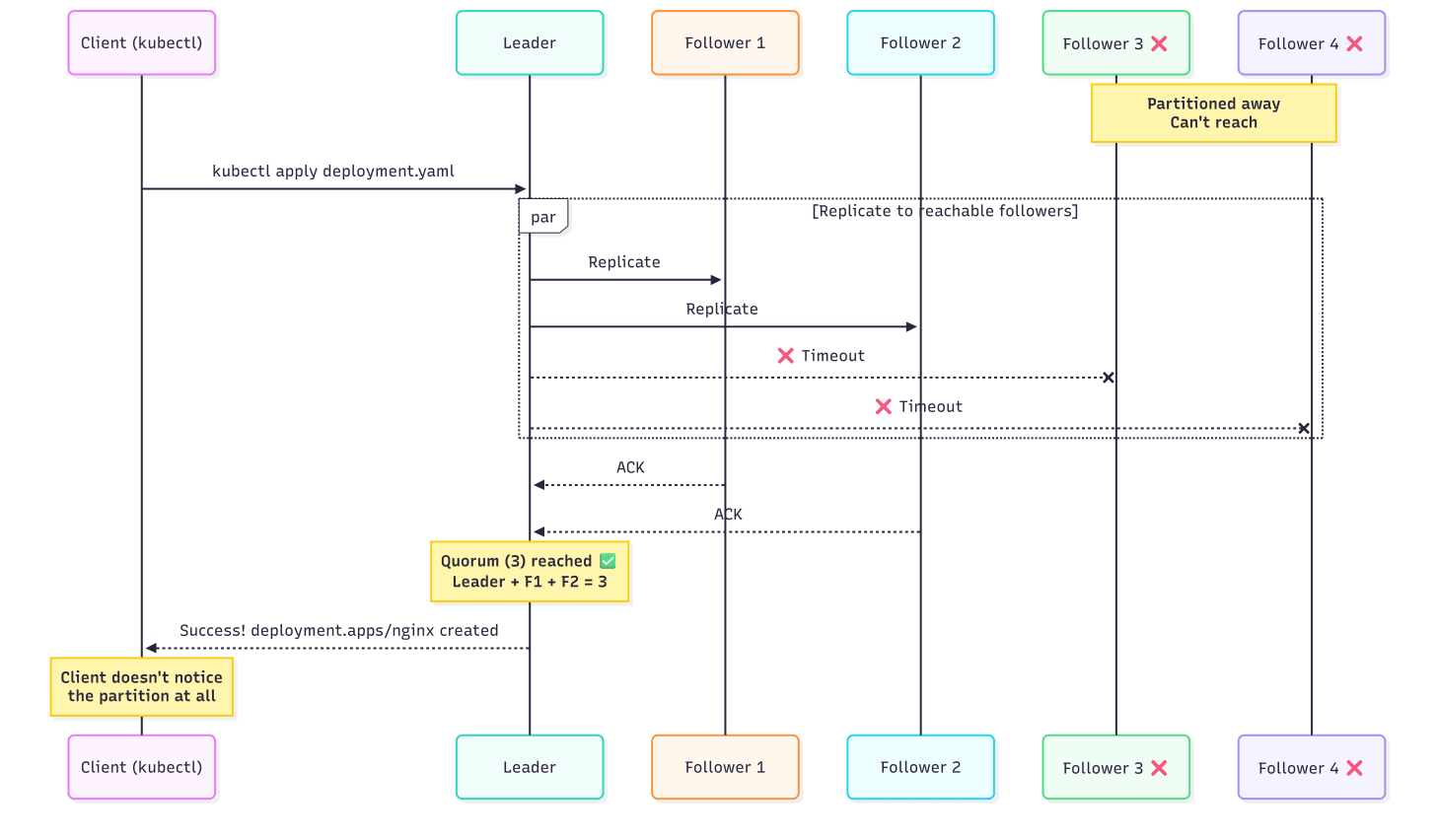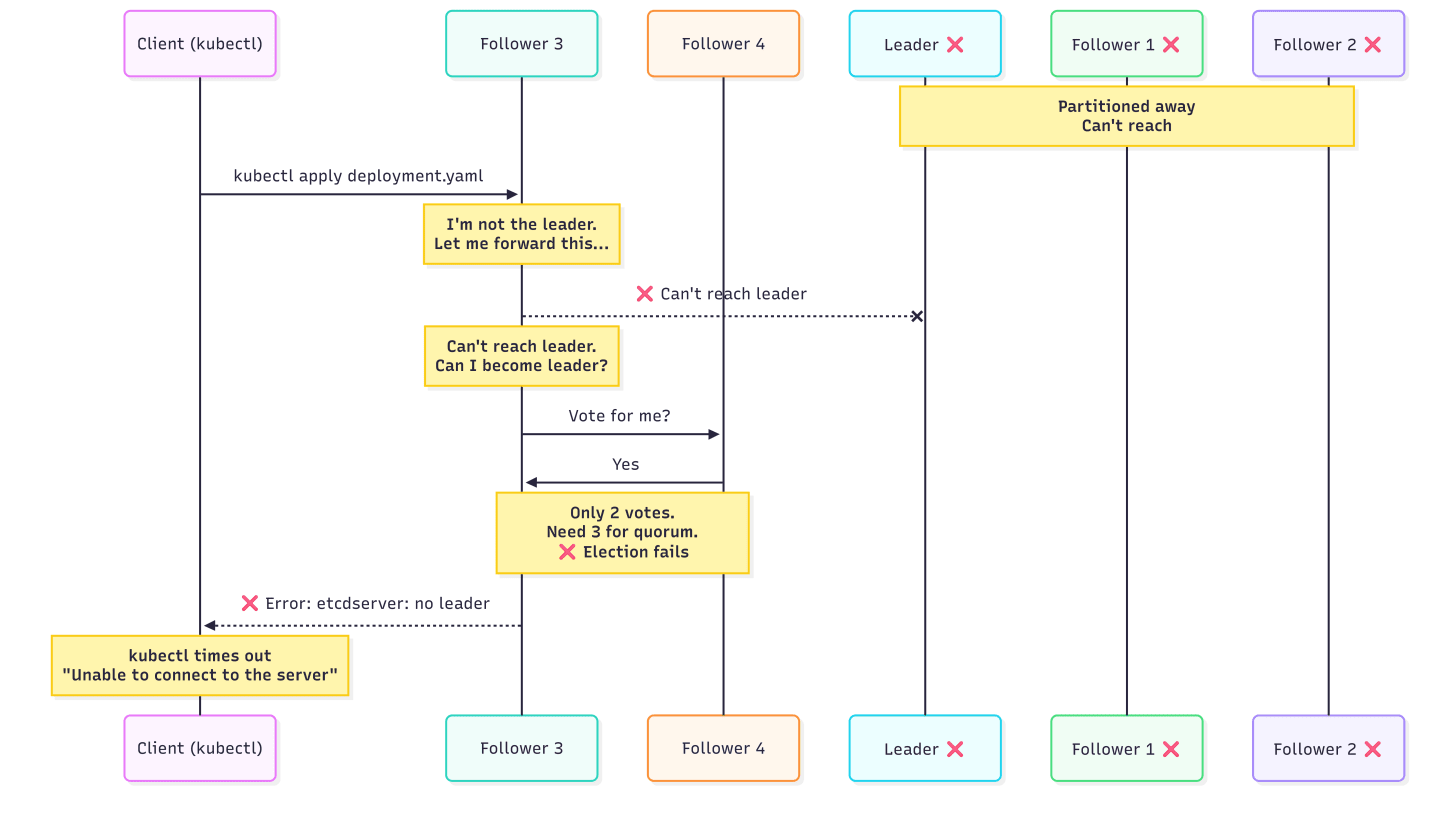 Ever experience a situation where kubectl commands hang or fail during cluster instability? That’s etcd behaving like a CP system, as it was designed to be. If etcd can’t reach quorum, it’ll stop accepting writes. Your kubectl apply commands time out, it’s safer to deny the write.