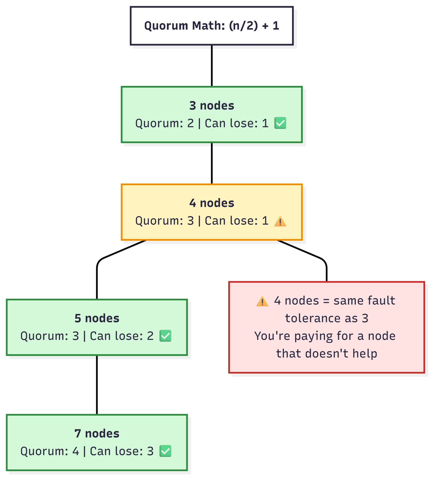 Always use odd numbers. A 4-node cluster has the same fault tolerance as a 3-node cluster—you’re paying for a node that doesn’t improve availability.