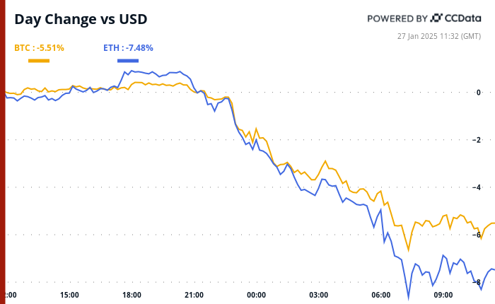 Bitcoin Dives to Under $99K as DeepSeek, FOMC Steal Trump Effect (CoinDesk): Bitcoin fell below $99,000 as traders braced for this week’s FOMC meeting, and Chinese startup DeepSeek’s advanced AI model pressured U.S. tech valuations, weighing on market sentiment and crypto prices.