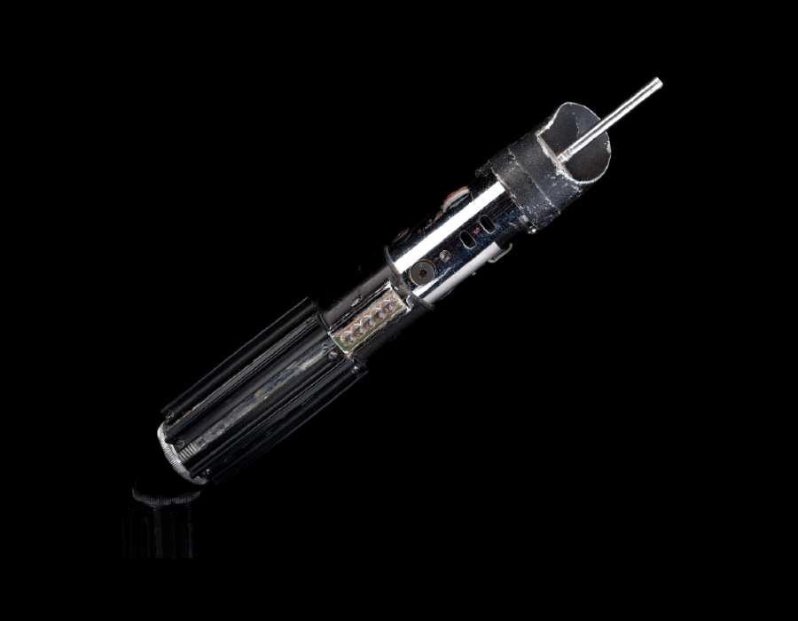 Darth Vader had this weapon in hand in Star Wars: The Empire Strikes Back (1980) and Return of the Jedi (1983). As noted by Propstore, it’s made from a 1950s British camera flash bulb attachment, which prop makers modified with plastic grips, electrical wires, and magnification bubbles used in vintage calculators.