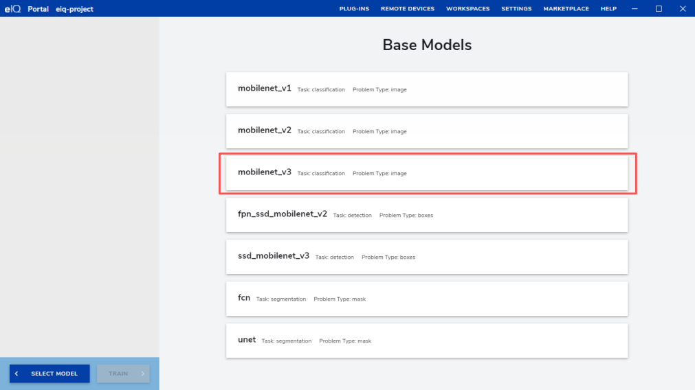 This paper uses the base model provided by eIQ Portal, so select ”BASE MODEL” as shown in the figure below.