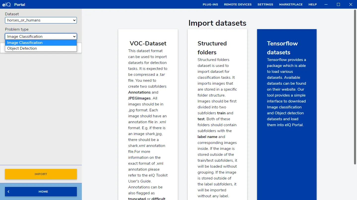 Also, there is a ”Problem type” drop – down menu in the upper – left corner, which represents the type of task. As shown below, this version of the tool only provides two types, one is image classification and the other is object detection. In the object detection task, there is only one dataset, coco/2017. This dataset can detect 80 types of object recognition, with 118,287 images as the training set, 5,000 images as the validation set, and 20,288 images as the test set.