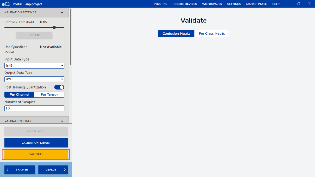 In the model validation interface, you also need to set the validation parameters, including the Softmax Threshold and some quantization parameters.