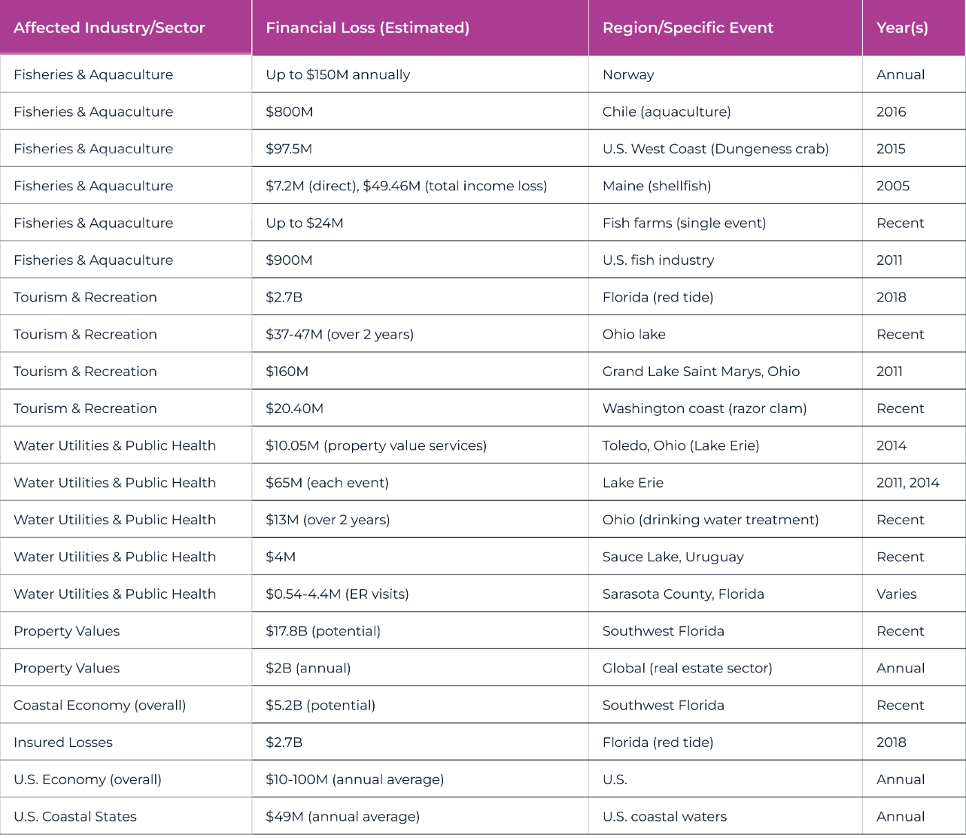 Extreme events carry even higher risks. In Southwest Florida, a major bloom could trigger $5.2 billion in coastal economic losses and $17.8 billion in lost property value. Such an event could eliminate 43,000 jobs and cost the fishing industry $460 million.